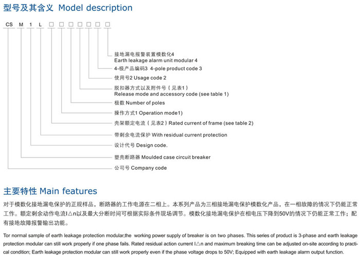 CSM1L(CM1L) 帶剩餘電流保護塑殼斷(duàn)路器,額定絕緣電壓800V。適用於交(jiāo)流50Hz, 額定工作電壓400V,額定工作電流至630A的電路中(zhōng)作不頻繁(fán)轉換及電動機不頻繁起動之用。具有過載、短路和欠電壓保護功能,保護電路(lù)和(hé)電源設(shè)備不受損壞。能對過電流保護(hù)不能檢(jiǎn)測出的由接地故障而可能引起的(de)火災危險提供保護。