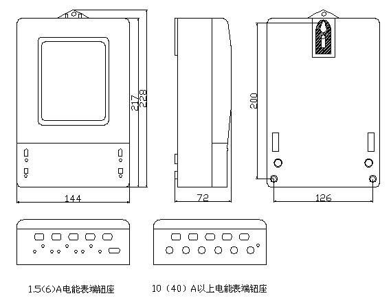 5.2電(diàn)表上部有掛鉤螺釘孔,用M4掛鉤螺釘固定,電表下部有2個安裝孔用M4X10或M4X12普通螺(luó)釘固(gù)定在接線板上。電能表的安裝、尺寸如圖下:
