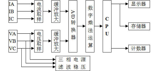 電能表工作時(shí),電壓、電(diàn)流經取樣電路分別取樣後,送至大規模專(zhuān)用集成電路緩衝放大、再由16位A/D轉(zhuǎn)換器轉(zhuǎn)換成數字信號,經數字乘法器運算後,送到CPU進行處理,最後,CPU將處理過的數據根據需要送至顯示部分、步進計(jì)數器(qì)等輸出單元。
