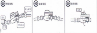 7.1.7將表接頭套入接頭螺母後安裝(zhuāng)到管道上,然後扭轉接頭螺母將遠傳有線閥控水表安裝到管道上,保持遠(yuǎn)傳有線閥控水表讀數盤水平向上,水表與管道連接時不應受過大(dà)的折彎力,以避免損壞遠傳有線閥控水表接(jiē)口斷裂。禁止出現如下圖所式安裝方式: