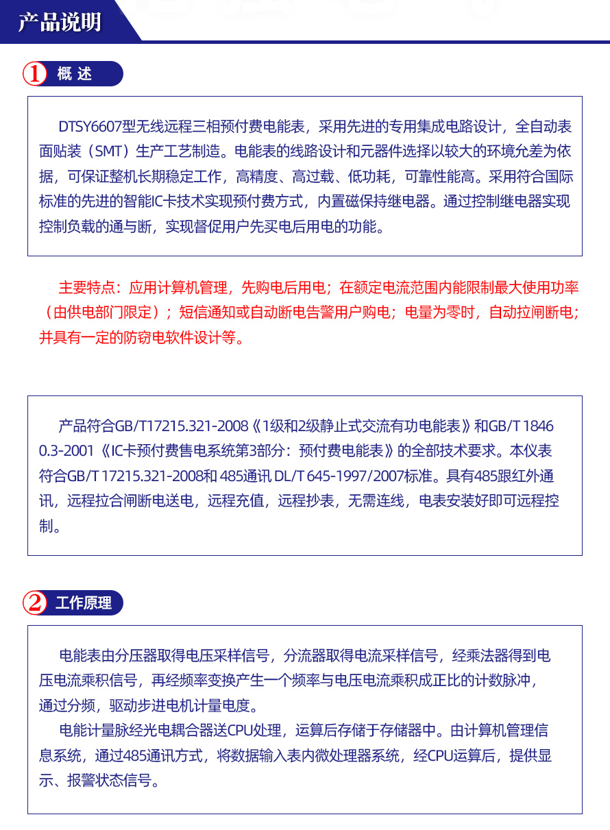 其(qí)性能指標符合GB/T 17215-2002《1級和2級靜止式交流有功電度表》中對電子式有功電度表的技術要求,符合GB/T15284-2002《多費率電能表(biǎo) 特殊要求(qiú)》對複費率電能表的技術要求,並符合GB/T18460-2001《IC卡預付費售電係統》的各項技術要求(qiú)。