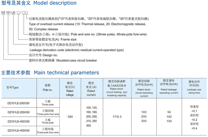 DZ101LE係列漏電斷(duàn)路器是由(yóu)DZ10塑料外殼式斷路器派生(shēng)而成,具備斷(duàn)路器功能外,為了防止人身觸電及(jí)線路漏電,在斷路器上加(jiā)裝漏電脫扣器,設計成(chéng)具有過(guò)載、短路、漏電:種保護為一體的產品。該產品是目(mù)前大容量線路器(qì)中較為(wéi)理想的(de)漏電保護電器。並符合IEC75-92、IE947.2國際標準及(jí)GB6829-95、CB14048.2-94國家標準。
